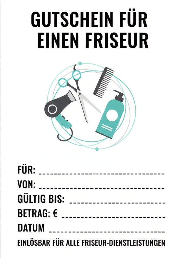 Du möchtest einen Gutschein für einen Friseurbesuch schnell erstellen und direkt verschenken? Hier findest du 6 Friseur-Gutschein Vorlagen – als Bild, PDF und Word. Einfach herunterladen, ausfüllen und sofort ausdrucken.