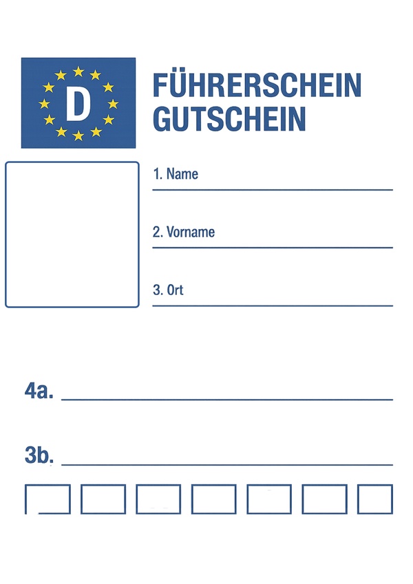 Diese Vorlage ist an den EU-Führerschein angelehnt und bietet Platz für Name, Vorname, Ort sowie weitere Angaben. Ideal, wenn du einen Gutschein im Stil eines echten Führerscheins verschenken willst.