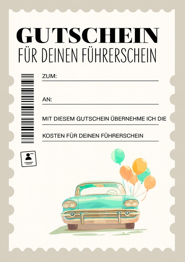 Verspielte Führerschein Gutschein Vorlage mit Oldtimer und Luftballons. Hier kannst du festhalten, dass du die Kosten für den Führerschein ganz oder teilweise übernimmst.