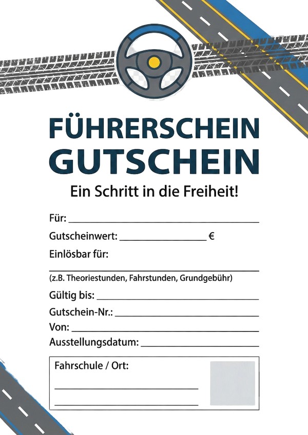 Mit dieser Führerschein Gutschein Vorlage verschenkst du den ersten Schritt in die Freiheit. Wähle ein Design, trage Name, Gutscheinwert und Fahrschule ein und drucke deinen Gutschein als JPG, PDF oder Word-Datei aus – ideal als Geschenk zum 18. Geburtstag oder für alle, die ihren Führerschein machen wollen.