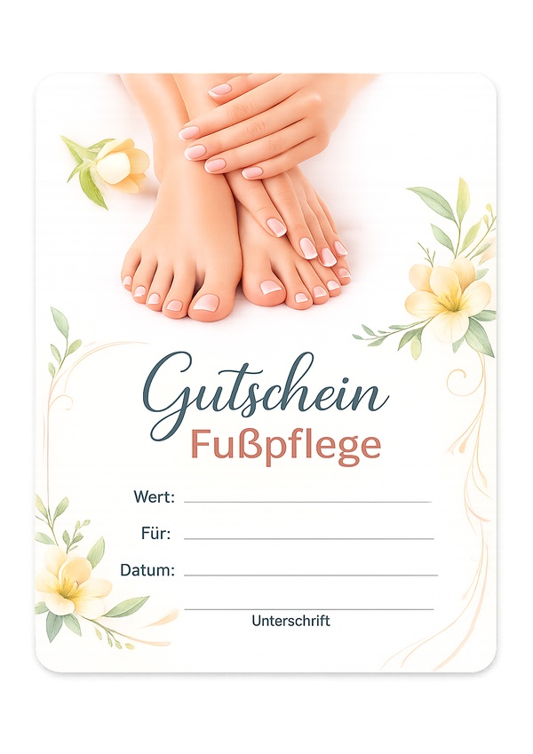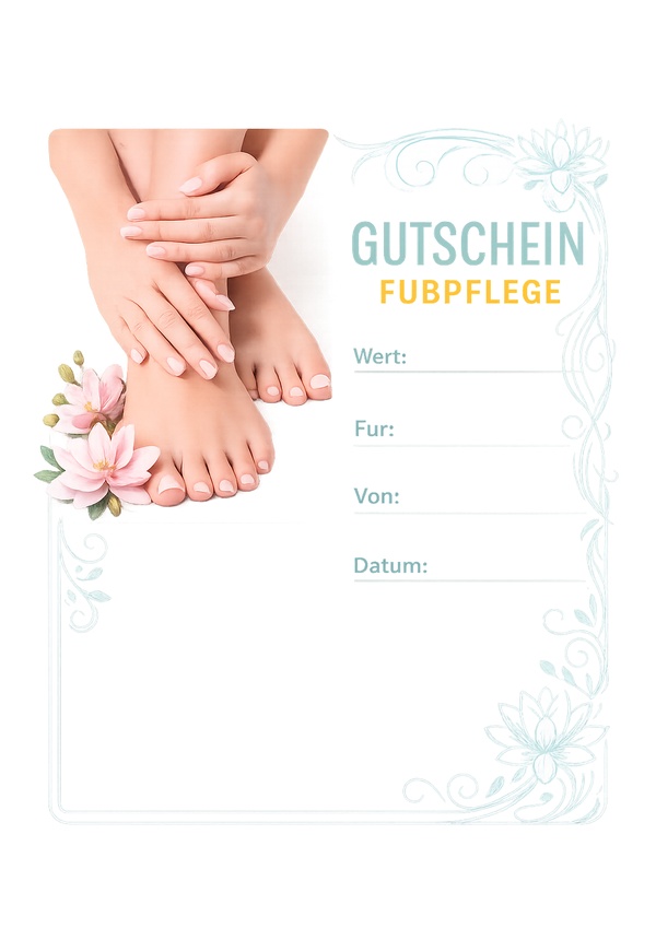 Elegante PDF-Vorlage mit Fokus auf gepflegten Füßen und floralen Details. Die Felder für Wert, Für, Von und Datum sind klar strukturiert.