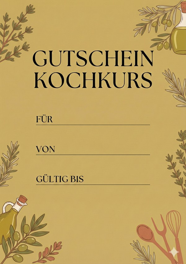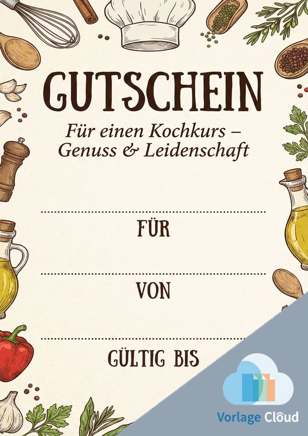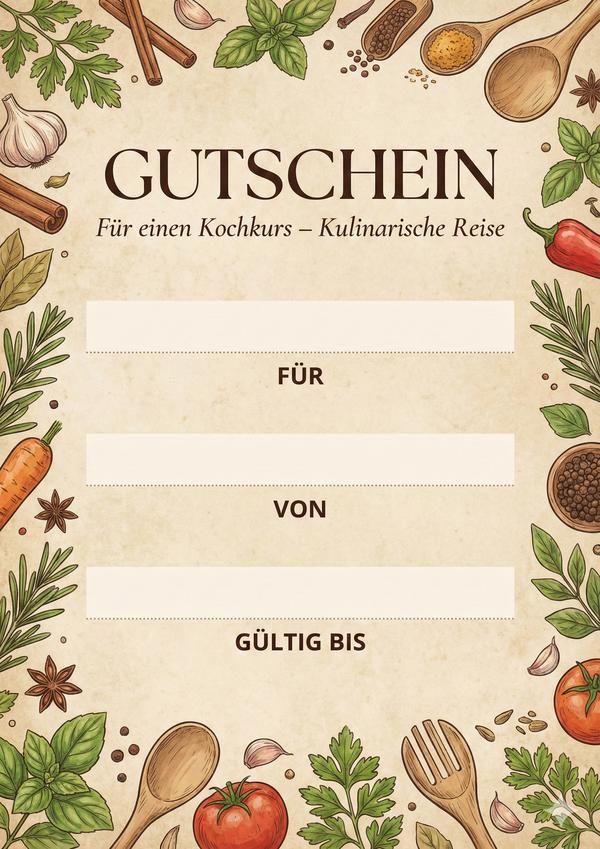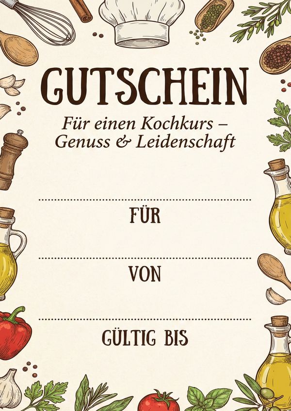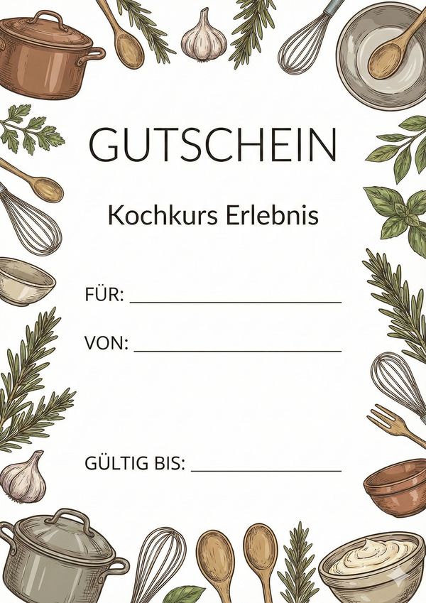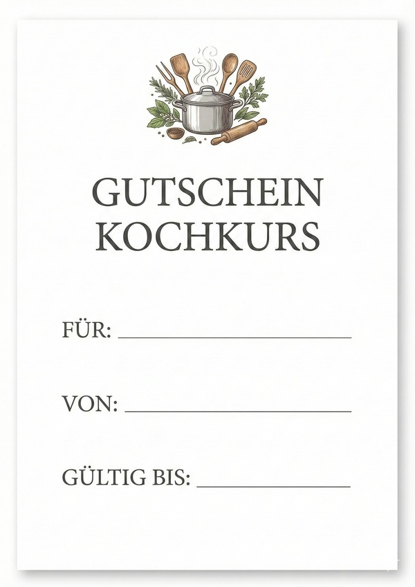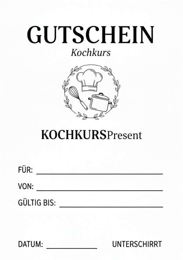 Du möchtest einen Kochkurs verschenken? Auf dieser Seite findest du passende Gutschein-Vorlagen für Kochkurse zum Ausdrucken – als Bild, PDF und Word. Einfach herunterladen, ausfüllen und als persönliches Geschenk überreichen.