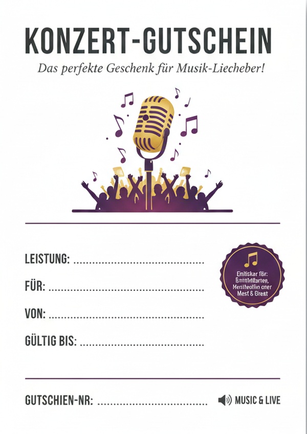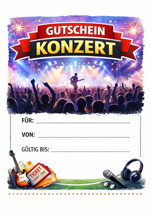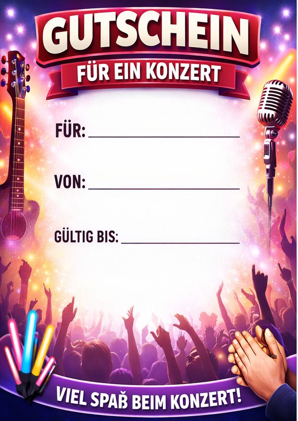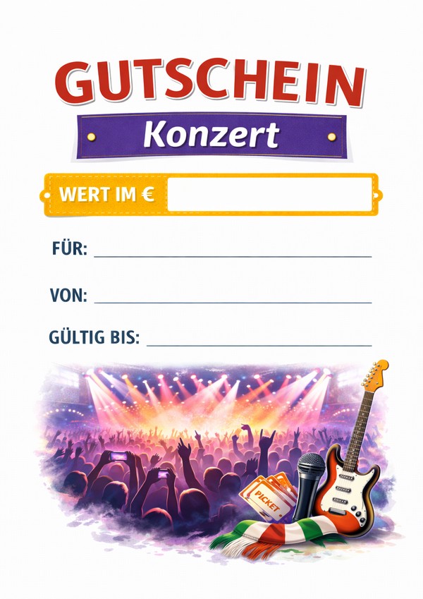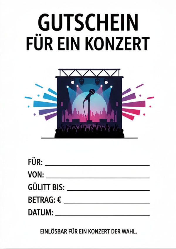 Du möchtest einen Konzertbesuch verschenken und brauchst dafür eine passende Gutschein-Vorlage? Hier findest du 6 Designs zum Ausdrucken – als Bild, PDF und Word. Einfach herunterladen, ausfüllen und als Geschenk überreichen.