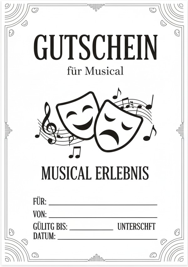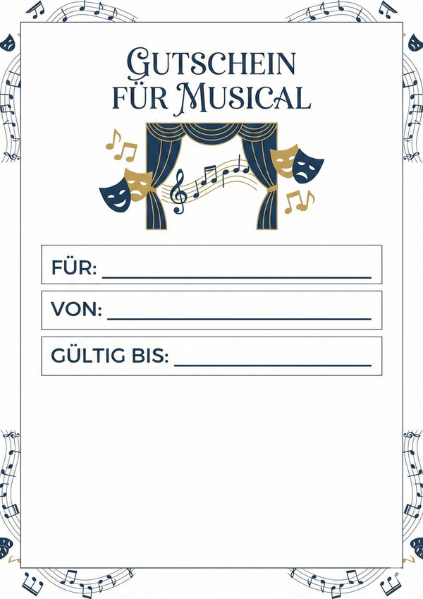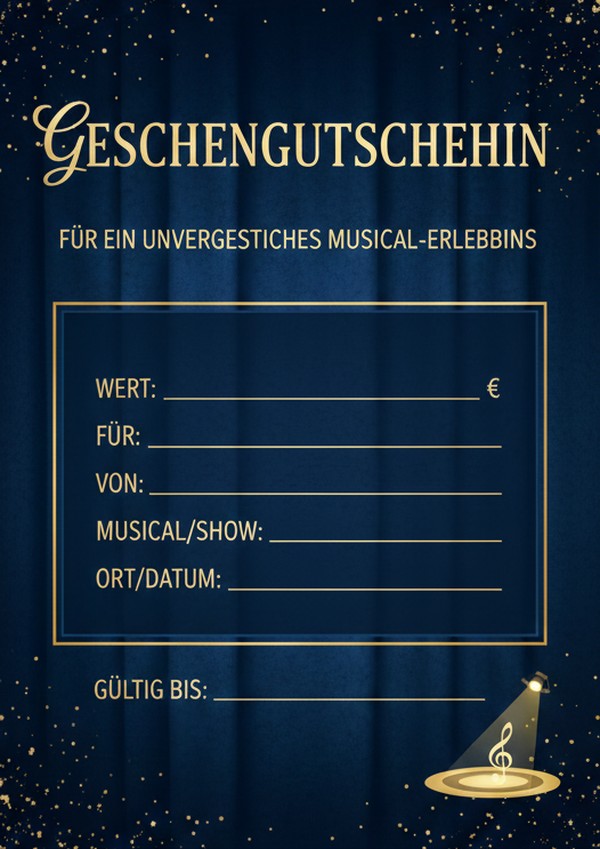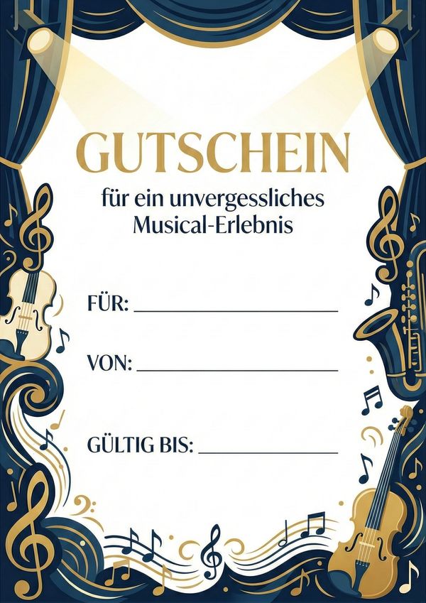 Du möchtest einen Gutschein für ein Musical verschenken und suchst eine passende Vorlage zum Ausdrucken? Hier findest du 6 stilvolle Gutschein-Vorlagen für Musical-Erlebnisse – als Bild, PDF und Word, sofort downloadbar und leicht anpassbar.