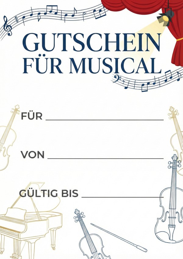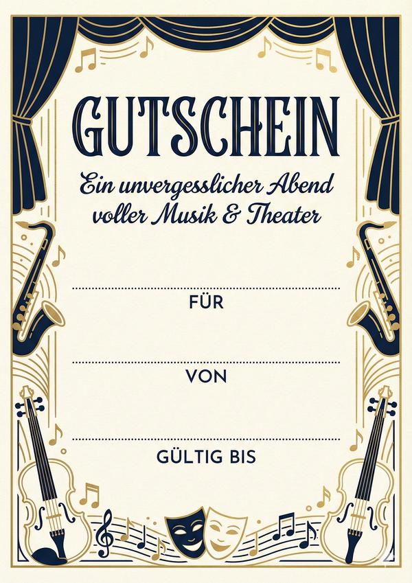 Klassische Musical-Gutscheinvorlage mit Instrumentenmotiven – ideal für ein persönliches Show-Geschenk.