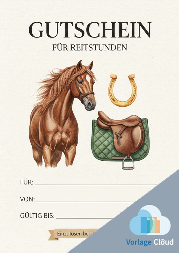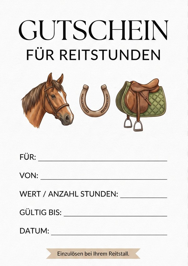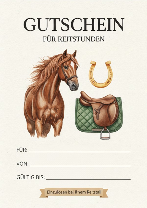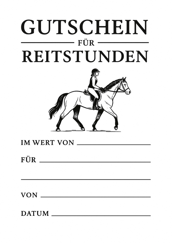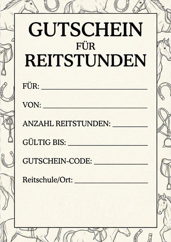 Der Gutschein passt perfekt für Reitschulen, Reiterhöfe oder private Reitstunden und lässt sich auf normalem Druckerpapier ausdrucken.