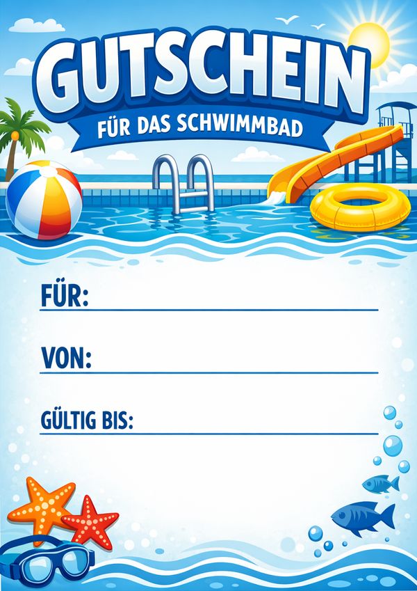 Du suchst eine Gutschein Vorlage fürs Schwimmbad, die du sofort ausdrucken und verschenken kannst? Hier findest du 5 moderne Gutschein-Vorlagen als PDF und Word – direkt downloadbar, leicht ausfüllbar und ideal für einen Besuch im Schwimmbad.