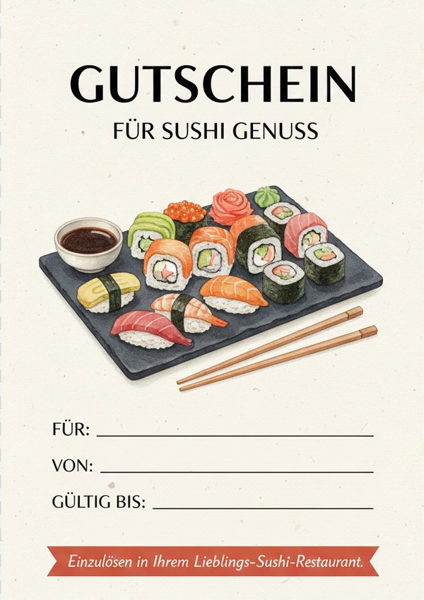 Ideal, wenn du schnell einen flexiblen Sushi Gutschein erstellen willst, der zu jedem Restaurant passt und trotzdem stilvoll aussieht.