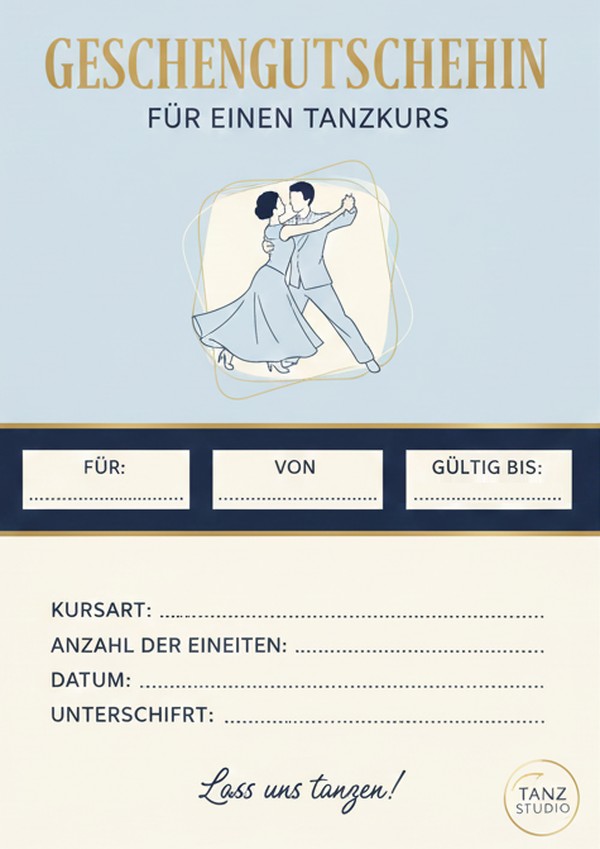 Ein Gutschein für Tanzstunden mit klarem Formular für Namen, Zeitraum und Kursdetails.