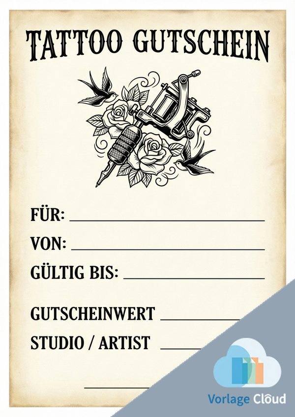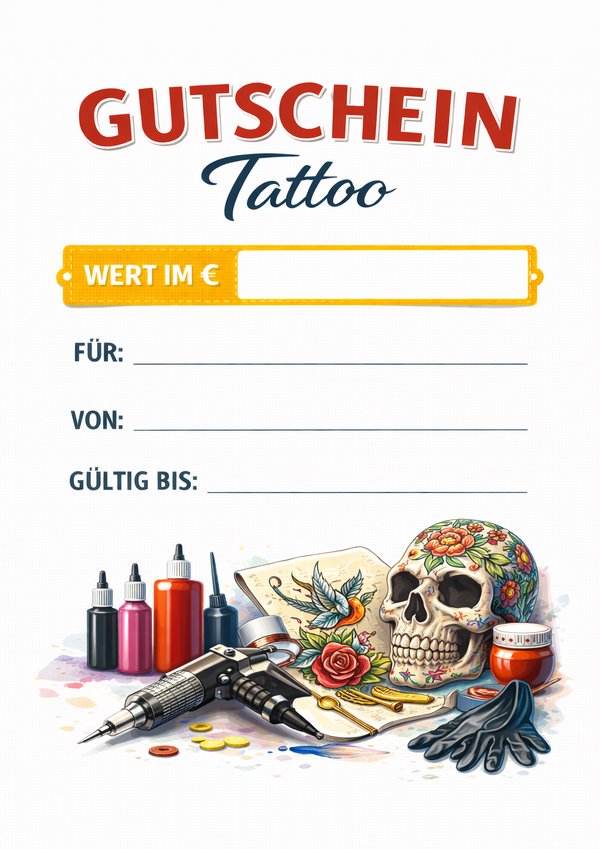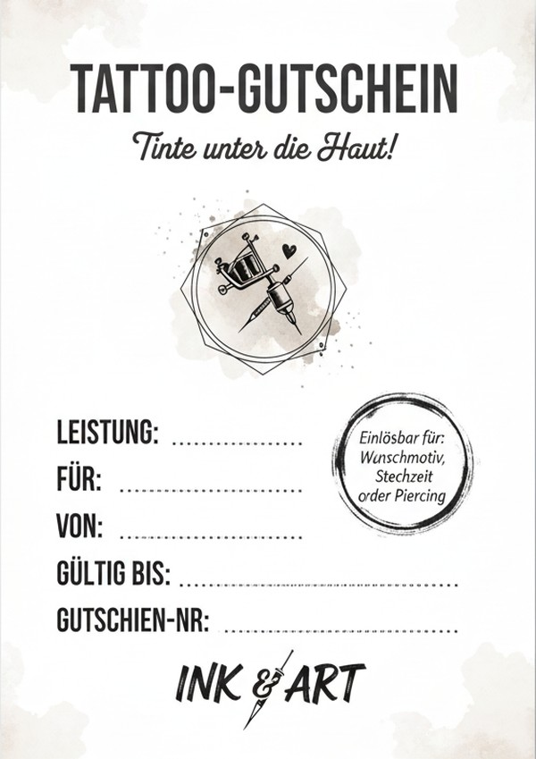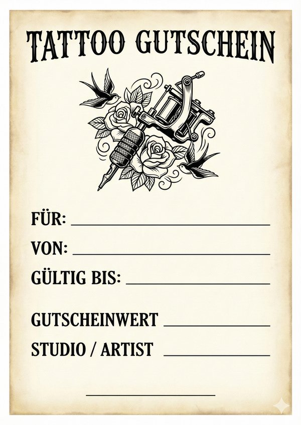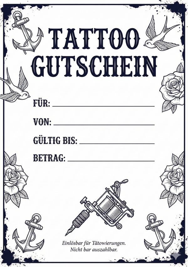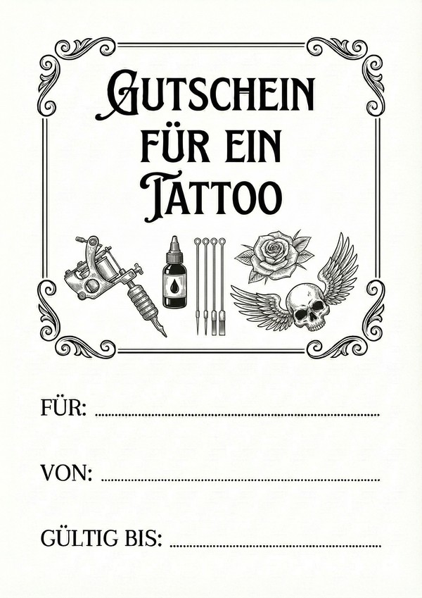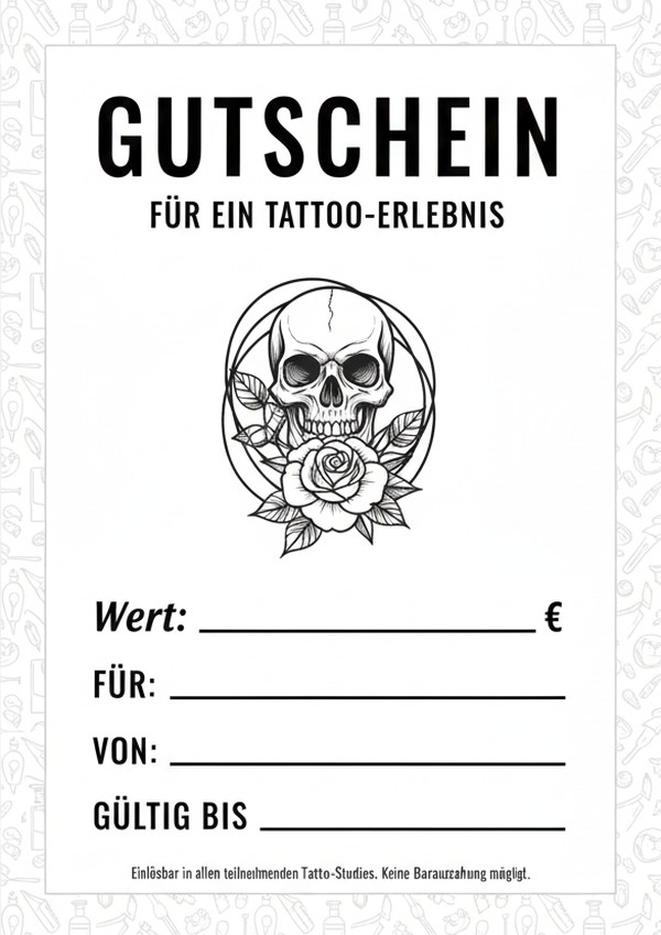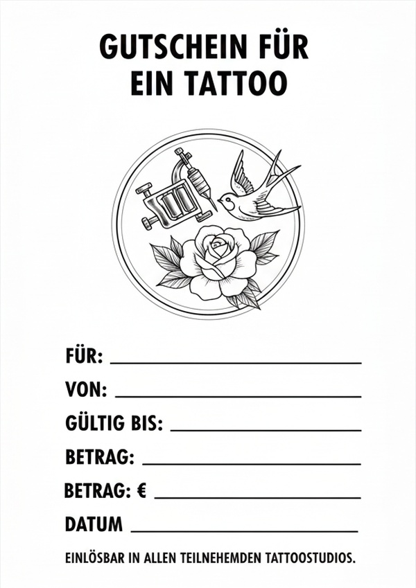 Du möchtest einen Tattoo-Gutschein schnell erstellen und direkt verschenken? Hier findest du 9 Tattoo Gutschein Vorlagen – als Bild, PDF und Word. Einfach herunterladen, ausfüllen und sofort ausdrucken.