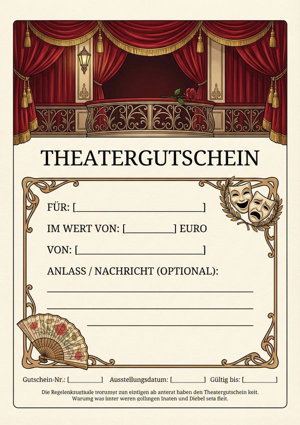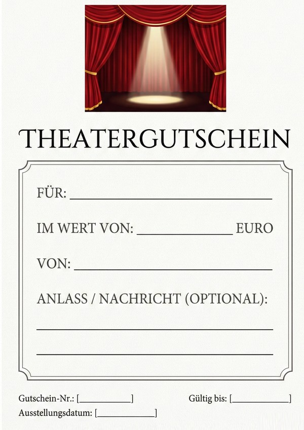 Suchst du einen Theatervoucher, den du schnell ausfüllen und verschenken kannst? Hier findest du verschiedene Gutschein-Vorlagen fürs Theater als PDF und Word – direkt downloadbar, individuell anpassbar und bereit zum Ausdrucken.