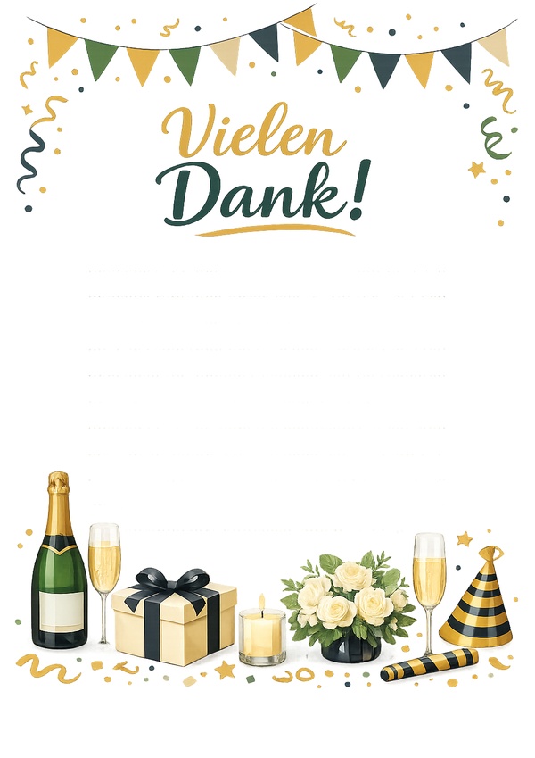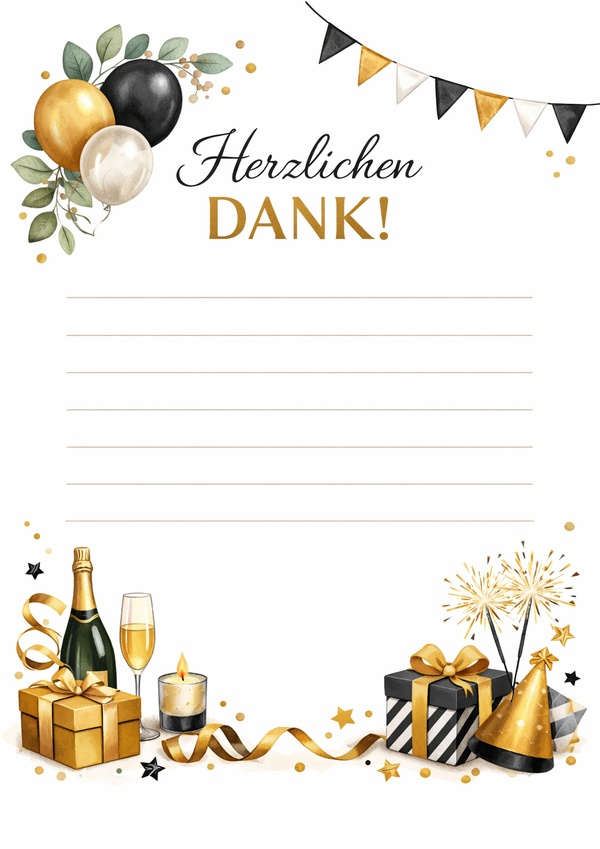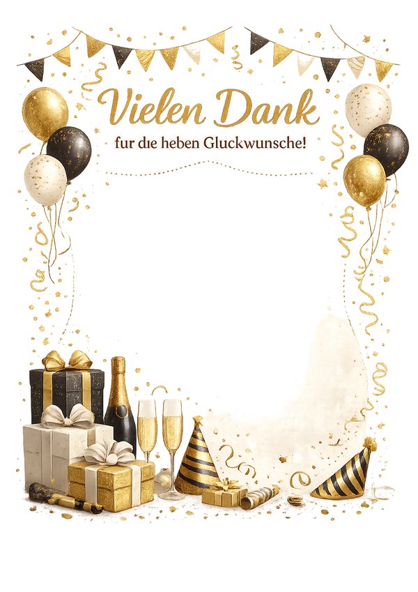 Eine luxuriöse Vorlage für einen besonderen Dankesspruch mit Ballons, Geschenken und Sekt in eleganter Gold-Optik.