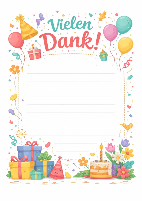 Diese Vorlage wirkt fröhlich, bunt und einladend und ist perfekt für eine verspielte Geburtstagsdanksagung.