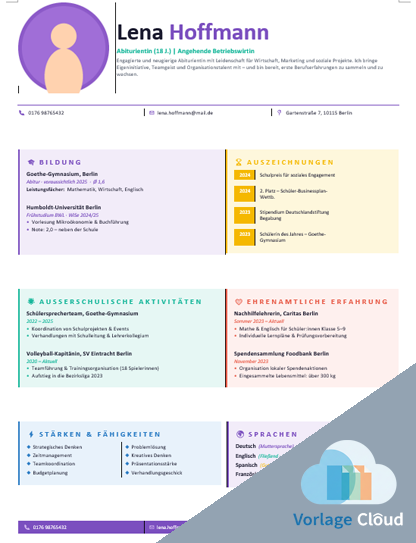 Sie eignet sich gut für Schüler, die ihren Lebenslauf in einer freundlichen Farbstruktur präsentieren und anschließend in Word weiterbearbeiten möchten.