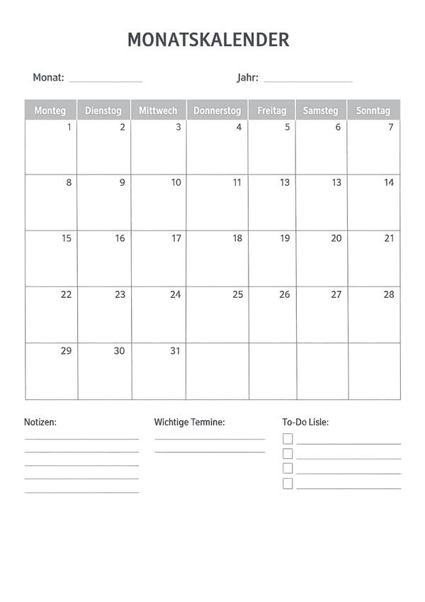 Du möchtest deinen Monat übersichtlich planen? Auf dieser Seite findest du praktische Monatskalender-Vorlagen zum Ausdrucken – ideal für Schule, Büro oder Zuhause. Alle Vorlagen sind kostenlos als JPG, PDF und Word verfügbar und lassen sich flexibel ausfüllen.