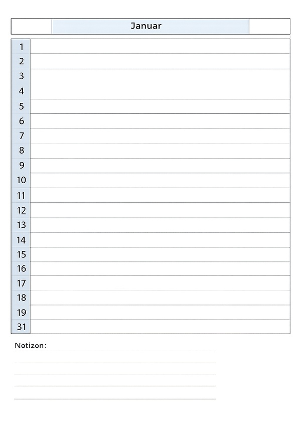 Monatskalender im Listenformat mit Tageszeilen und Notizbereich – perfekt für Termine im Überblick und schnelle Einträge.