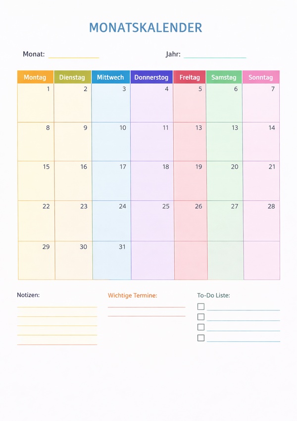 Farbig gestalteter Monatskalender mit Wochenraster sowie Bereichen für Notizen, wichtige Termine und eine To-Do Liste.