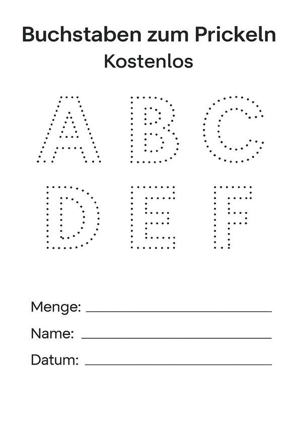 Diese Vorlage zeigt Buchstaben von A bis F als Punktlinien. Sie eignet sich hervorragend, um Buchstaben durch Prickeln zu üben und gleichzeitig die Handmotorik zu trainieren.