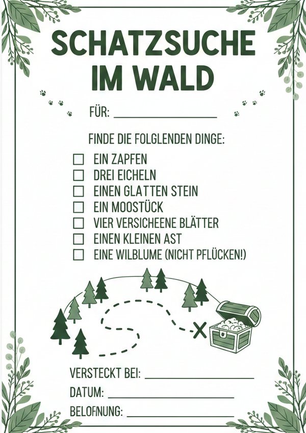 Möchtest du eine Schatzsuche im Wald planen und suchst passende Vorlagen zum Ausdrucken? Hier findest du verschiedene Schatzsuche-Wald-Listen und Aufgabenblätter als Bild, PDF und Word – ideal für Kindergeburtstage, Ausflüge oder den Kindergarten.