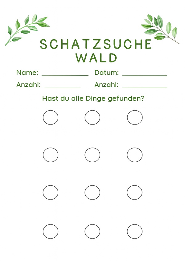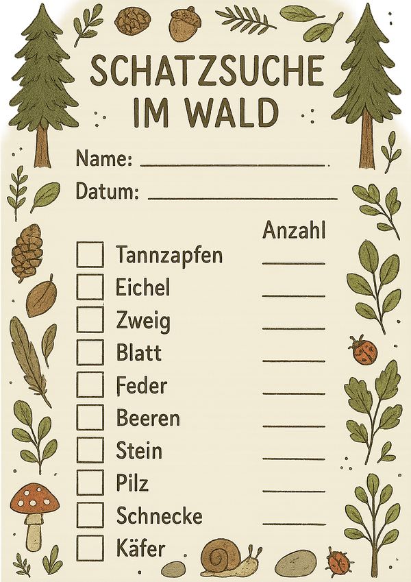 Diese Liste eignet sich perfekt für eine Schatzsuche mit Kindern im Wald. Die Kinder können typische Naturmaterialien wie Zapfen, Blätter oder Steine suchen, abhaken und die gefundene Anzahl eintragen.