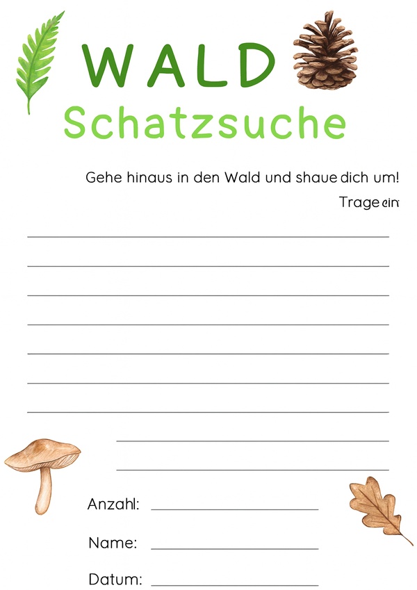 Hier können Kinder ihre eigenen Entdeckungen im Wald notieren. Die vielen Zeilen sind ideal für eine dokumentierende Schatzsuche, bei der Beobachtungen und Fundstücke beschrieben werden.